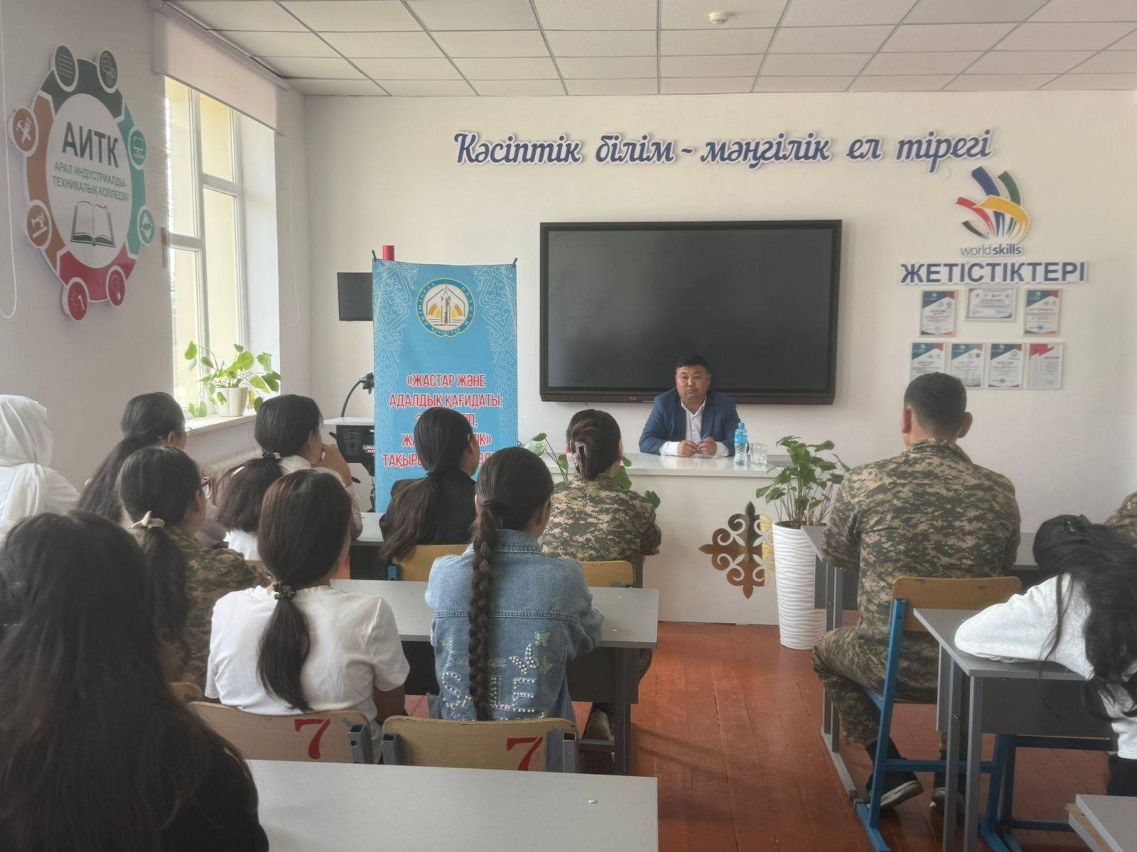 «Жастар және адалдық қағидаты: заң, тәртіп, жауапкершілік» тақырыбында колледж студенттері Қызылорда қаласы Текей батыр Қарпықұлы атындағы жоғары колледж директорының тәрбие жұмыстары жөніндегі орынбасары, заңгер Айтбенбетов Болатбек Серікбайұлымен кездесу өткізді.